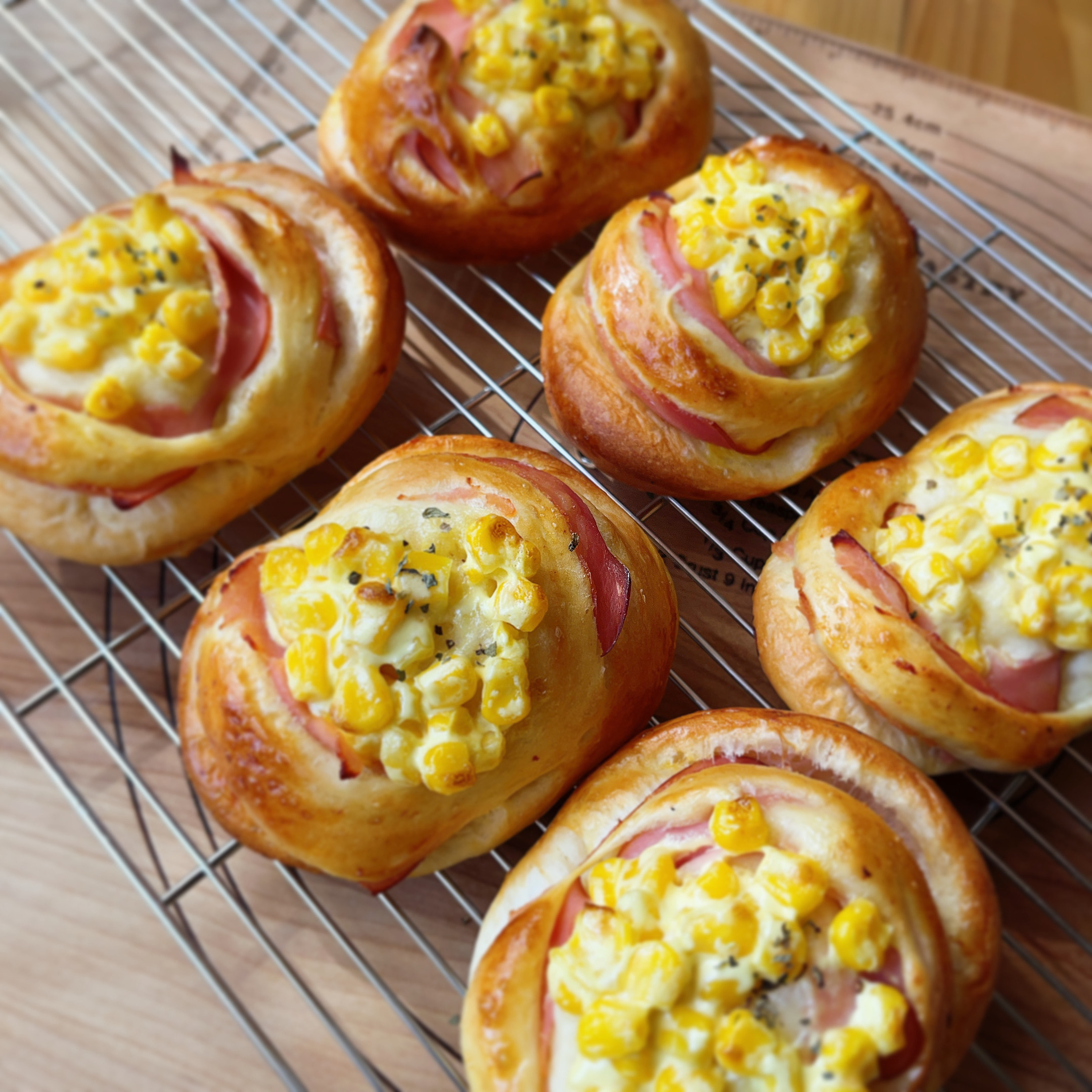 ふわふわソフトでほんのり甘い生地にハムを巻き込んで、マヨネーズであえたコーンをのせて焼き上げます。パン屋さん定番の大人気パンです♪