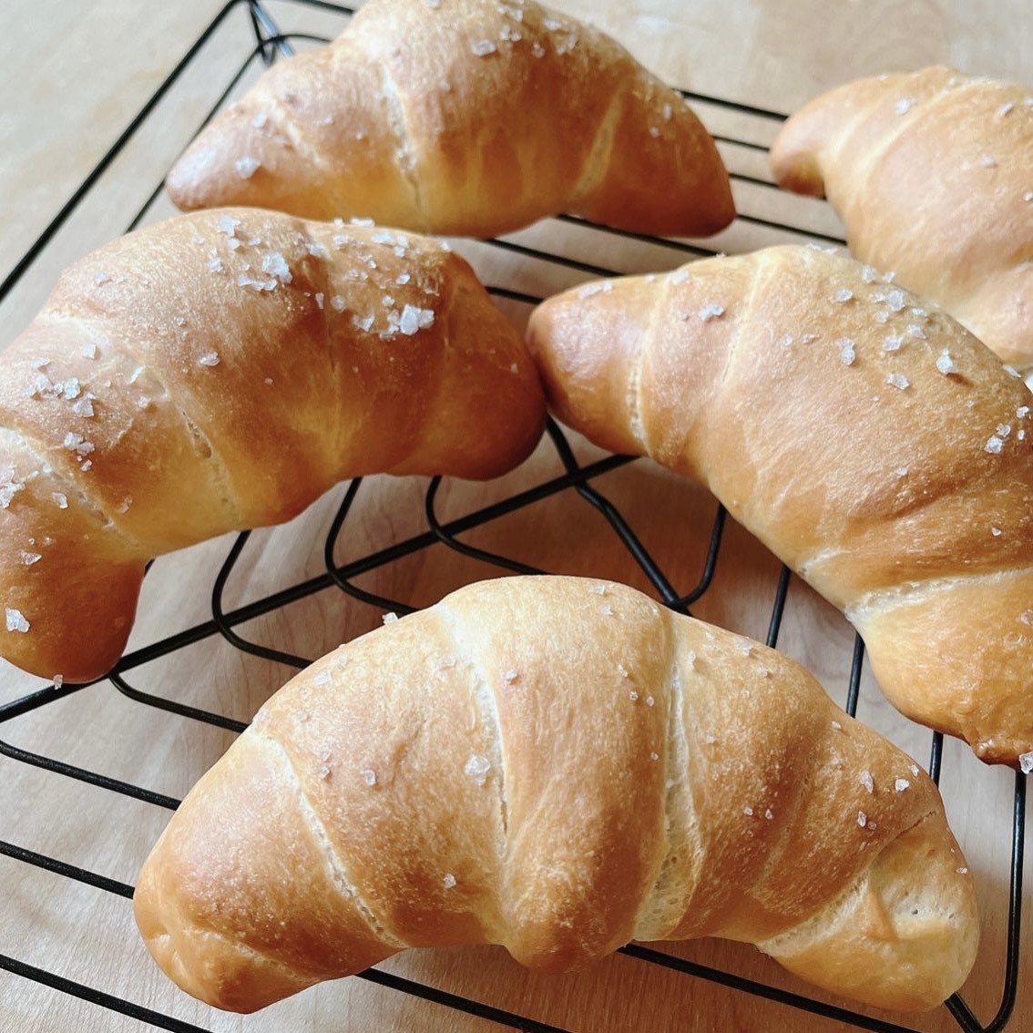 生地の中にバターを包み、くるくる巻いた形が特徴のパンです。 外はカリッと、中はもっちりとした食感に、じゅわ〜と滲みでるバターの風味と上から掛けた岩塩の塩味が絶妙な組み合わせ♡焼きたて最高に美味しい人気のパンです♪ (卵なし)